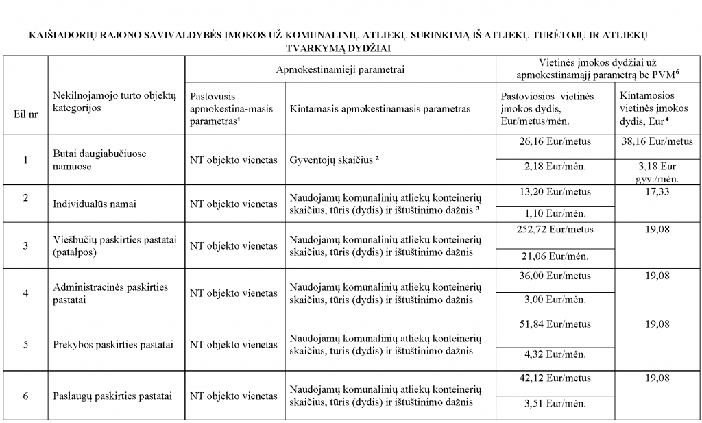 SĮ „Kaišiadorių paslaugos“ praneša, kad Kaišiadorių rajono savivaldybės taryba 2024 m. sausio 25 d. sprendimu V17E-21 pakeitė įmokų už komunalinių atliekų surinkimą iš atliekų turėtojų ir atliekų tvarkymą dydžius. Nuo 2020 m. 69,8 proc. išaugo KRATC atliekų sutvarkymo kaina. Dėl vartotojų kainų indekso augimo brango komunalinių atliekų surinkimo ir vežimo paslauga, dėl infliacijos didėjo visos perkamų paslaugų kainos. Pasikeitusios įmokos įsigalios nuo 2024 m. kovo 1 d. Paskutinį kartą įmokų dydžiai buvo keičiami Kaišiadorių rajono savivaldybės tarybos 2020 m. balandžio 30 d. sprendimu Nr. V17E-89.